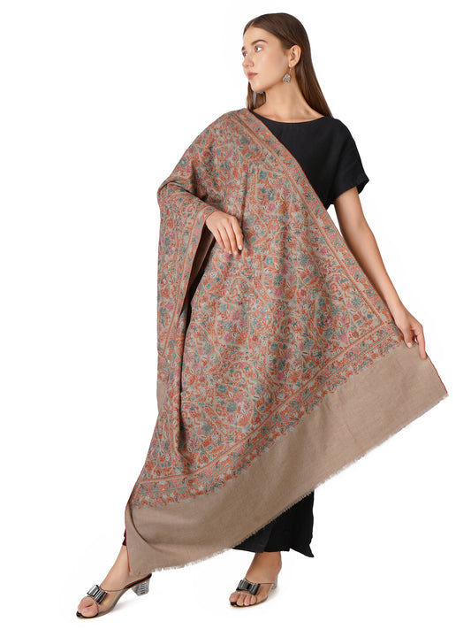 Luxurious Brown Pashmina Shawl with Intricate Sozni Embroidery
