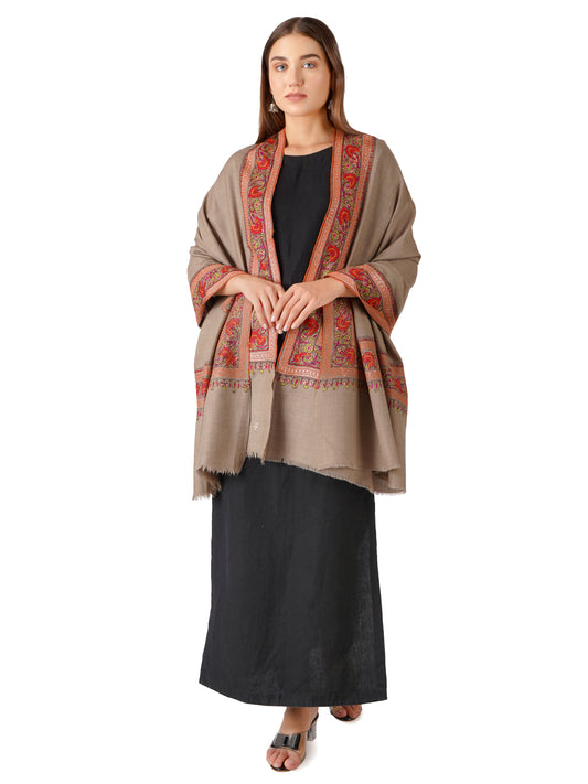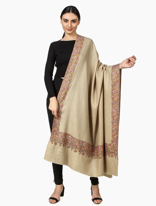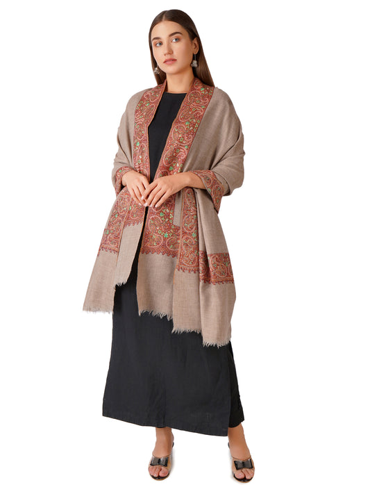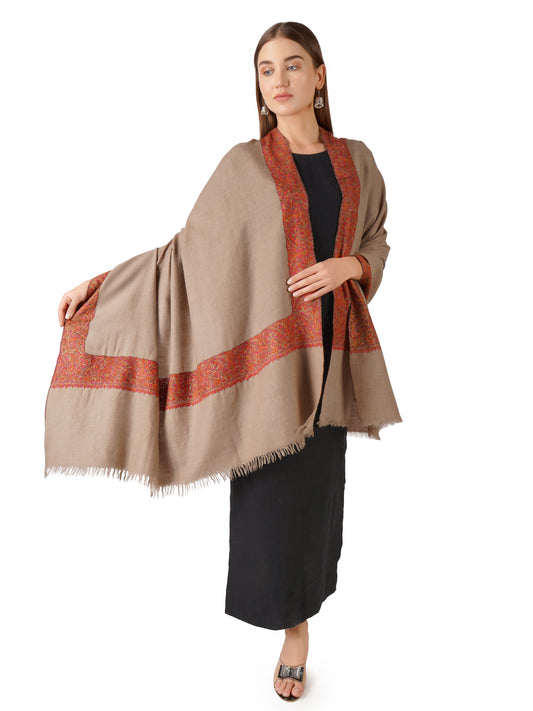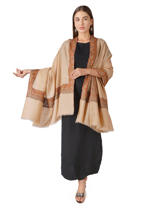 Luxurious Pashmina Shawl with Hand Sozni Border Embroidery - Natural Toosh