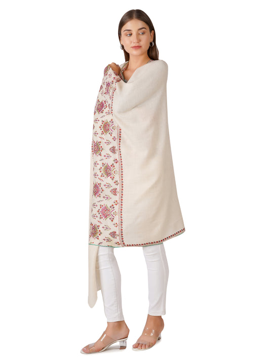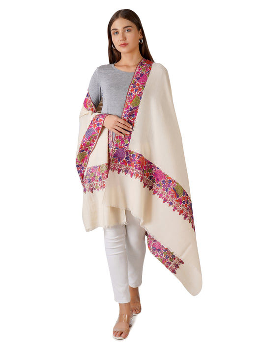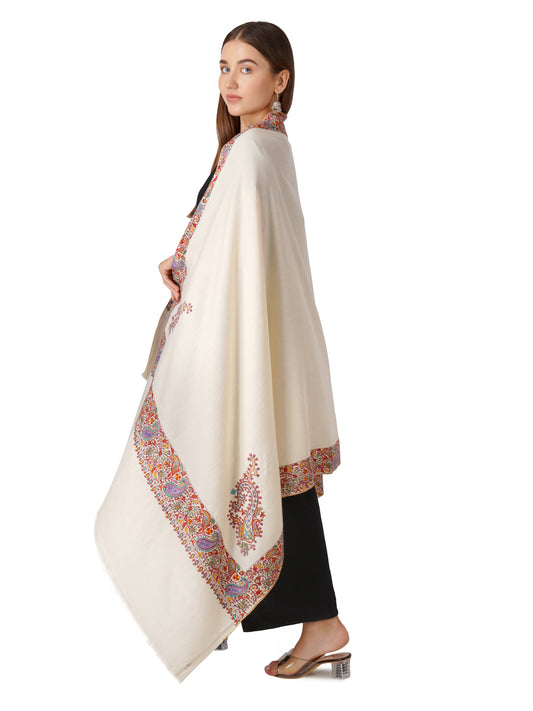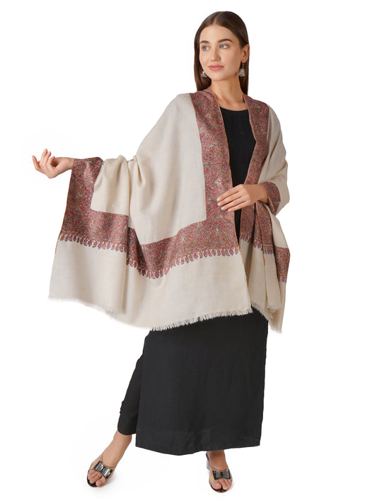 Elegant Kashmiri Pashmina Shawl with Handcrafted Embroidery on Borders - Off White