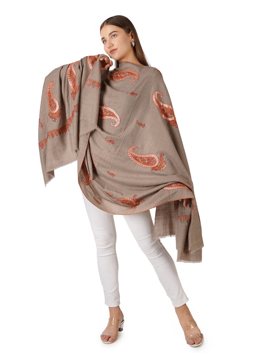Luxurious Brown Pashmina Shawl with Intricate Sozni Embroidery