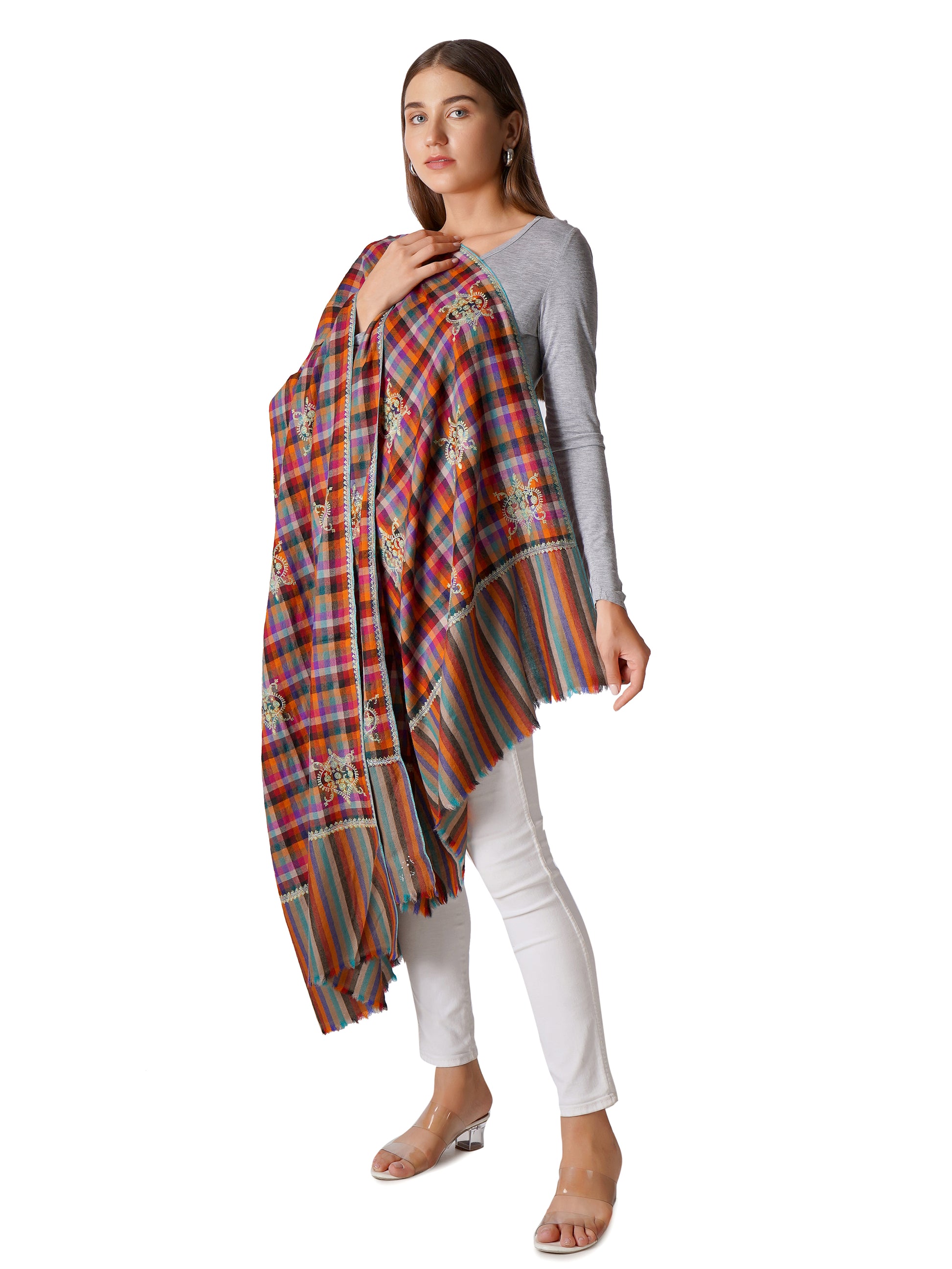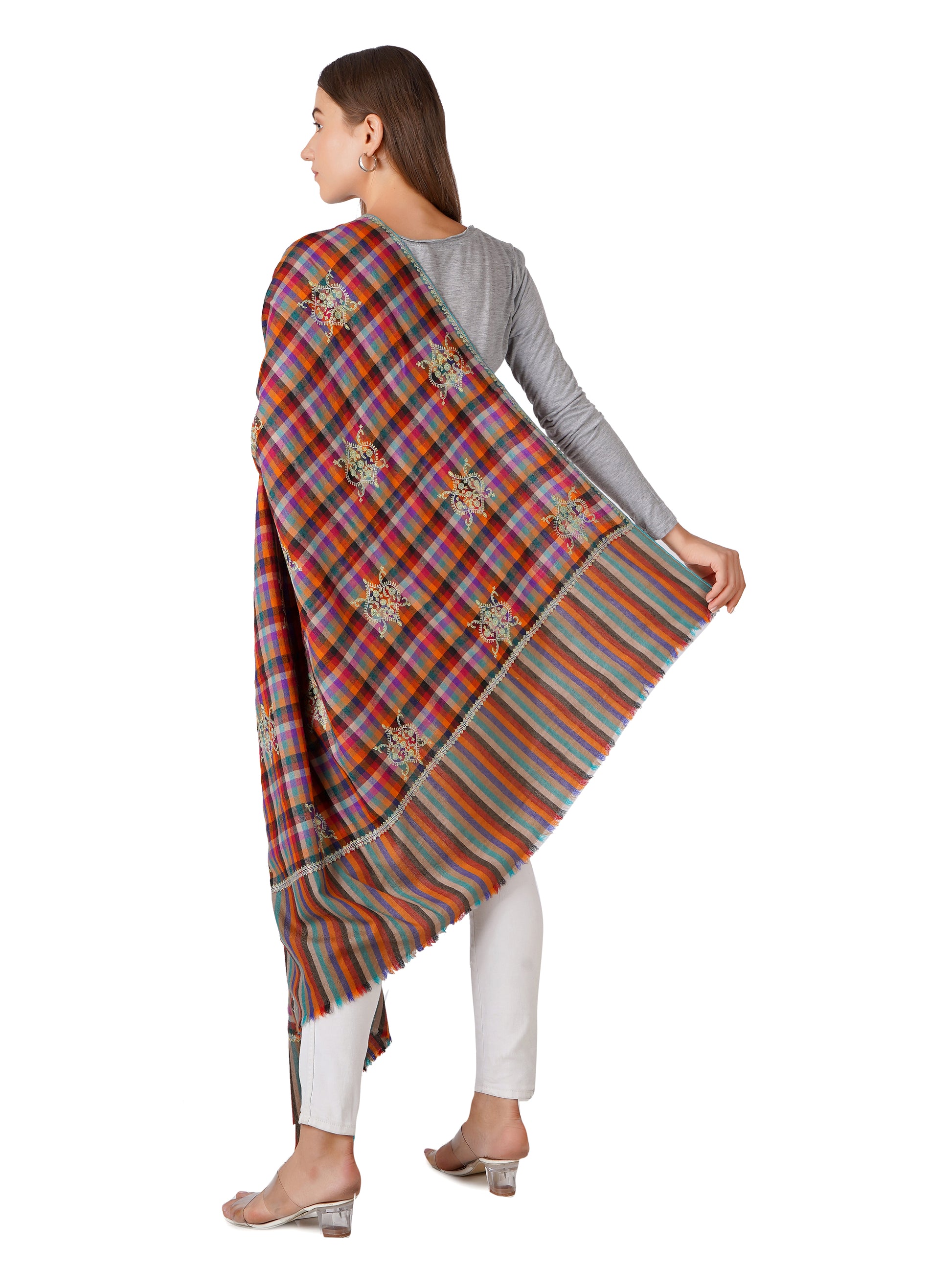Handcrafted Checkered Pashmina Shawl with Floral Embroidery Designs
